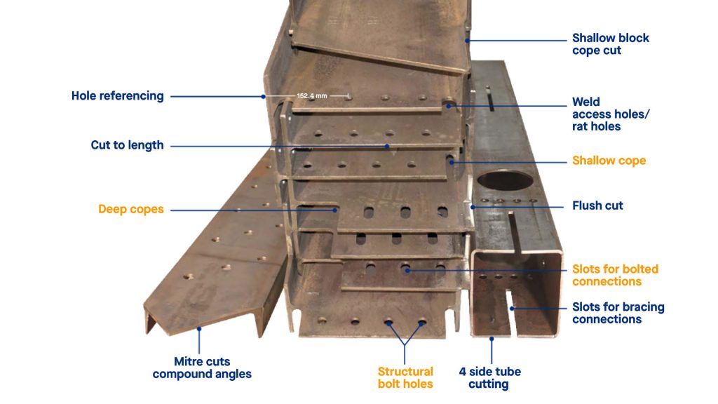 Our new plasma beamline can cut and process a range of steel products including structural, plate, tube and merchant bar. We can supply customers with semi-finished components ready for final fabrication and installation.